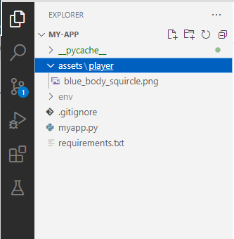 Create an “assets” folder and then copy the default folder into that. Create a player folder directly in the assets folder and move or copy blue_body_circle, blue_body_squircle.png, and face_a.png from the default folder into that folder. Also copy tile_coin into a food folder. We can delete default later.